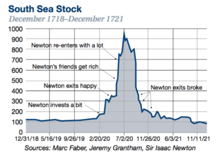 Το χρηματιστηριακό φιάσκο του Νεύτωνα από την Εταιρεία Νότιας Θάλασσας έγινε διάσημο με την (φερόμενη ως) δήλωσή του, ότι «μπορεί να υπολογίσει τις κινήσεις των ουράνιων σωμάτων, αλλά όχι την τρέλα των ανθρώπων».
