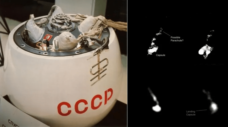 (Αριστερά) Μακέτα του σοβιετικού διαστημοπλοίου Venera 7, που ήταν παρόμοιο με το Cosmos 482. (Δεξιά) Εικόνες του σοβιετικού διαστημοπλοίου στην τροχιά της Γης. Τραβήχτηκαν από τον Ολλανδό αστρονόμο-φωτογράφο Ralf Vandebergh