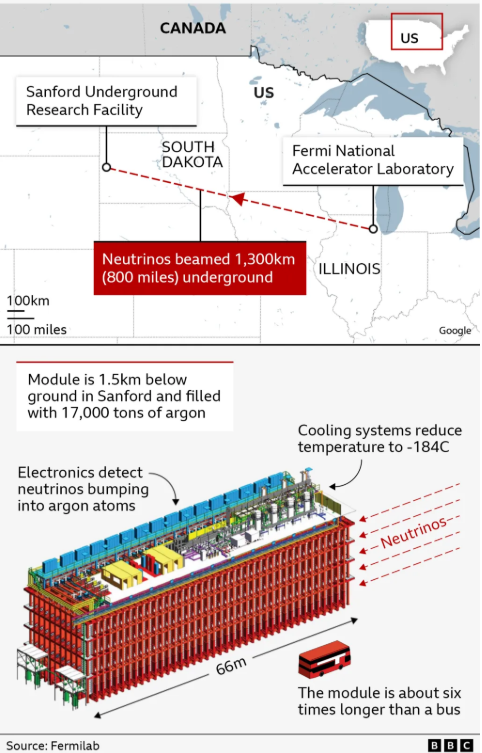 Οι φυσικοί κατασκευάζουν ανιχνευτές με σκοπό την μελέτη των νετρίνων με την ελπίδα να καταλάβουν ‘γιατί υπάρχουν’. Η αμερικανική ερευνητική ομάδα ελπίζει να βρεί την απάντηση βαθιά κάτω από το έδαφος με το πείραμα Deep Underground Neutrino Experiment (Dune). Οι επιστήμονες θα φτάσουν 1.500 μέτρα κάτω από την επιφάνεια, σε τρία τεράστια υπερ-υπόγεια σπήλαια. Η κλίμακα είναι τέτοια που τα συνεργεία κατασκευής και οι μπουλντόζες τους συγκριτικά να μοιάζουν με μικρά παιχνιδάκια. Ο επιστημονικός διευθυντής αυτής της εγκατάστασης, Dr Jaret Heise, περιγράφει τα γιγάντια σπήλαια ως «καθεδρικούς ναούς της επιστήμης».