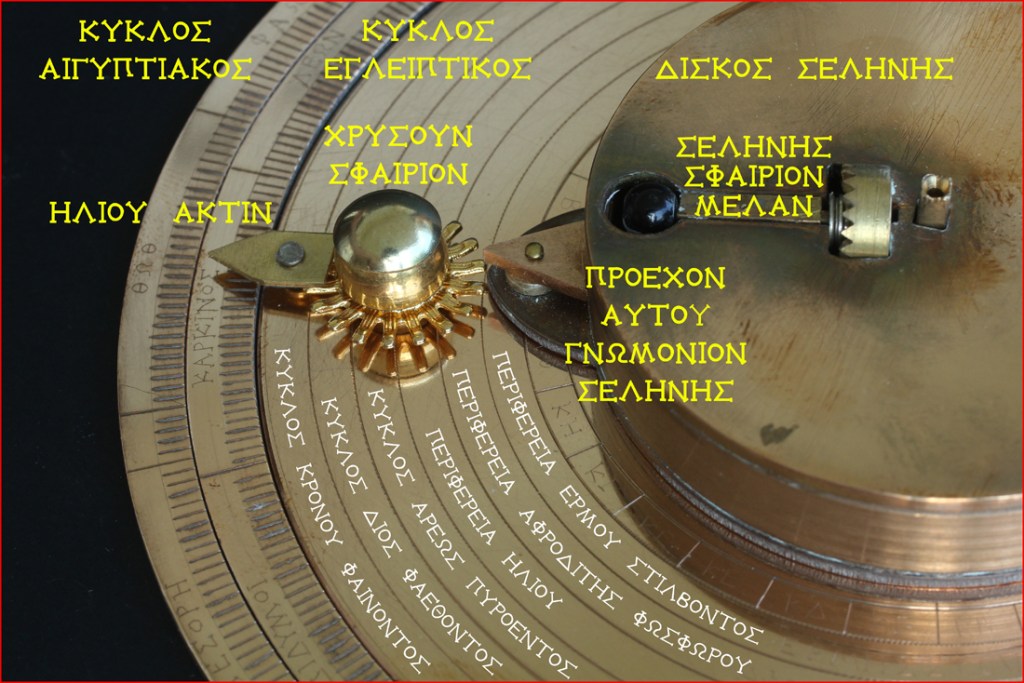 Στιγμιότυπο από την κεντρική πρόσθια πλευρά του Μηχανισμού των Αντικυθήρων. Εικονίζονται το Σφαιρίον της Σελήνης (ότε Μέλαν, ότε Λευκόχρουν), το Χρυσούν Σφαιρίον-Ηλιος, με τον δείκτη Ηλίου Ακτίν, οι χαραγμένοι κύκλοι-τροχιές (και όχι σφαιρία) των πλανητών, όπως αυτά αναφέρονται στο Εγχειρίδιο Χρήσης του Μηχανισμού των Αντικυθήρων (διασώζεται η φράση ΚΡΟΝΟΥ ΦΑΙΝΟΝΤΟΣ ΚΥΚΛΟΣ). Αμέσως μετά, διασώζονται ο δακτύλιος των εκλειπτικών αστερισμών και ο δακτύλιος του αιγυπτιακού ημερολογίου. (©The FRAMe Project)