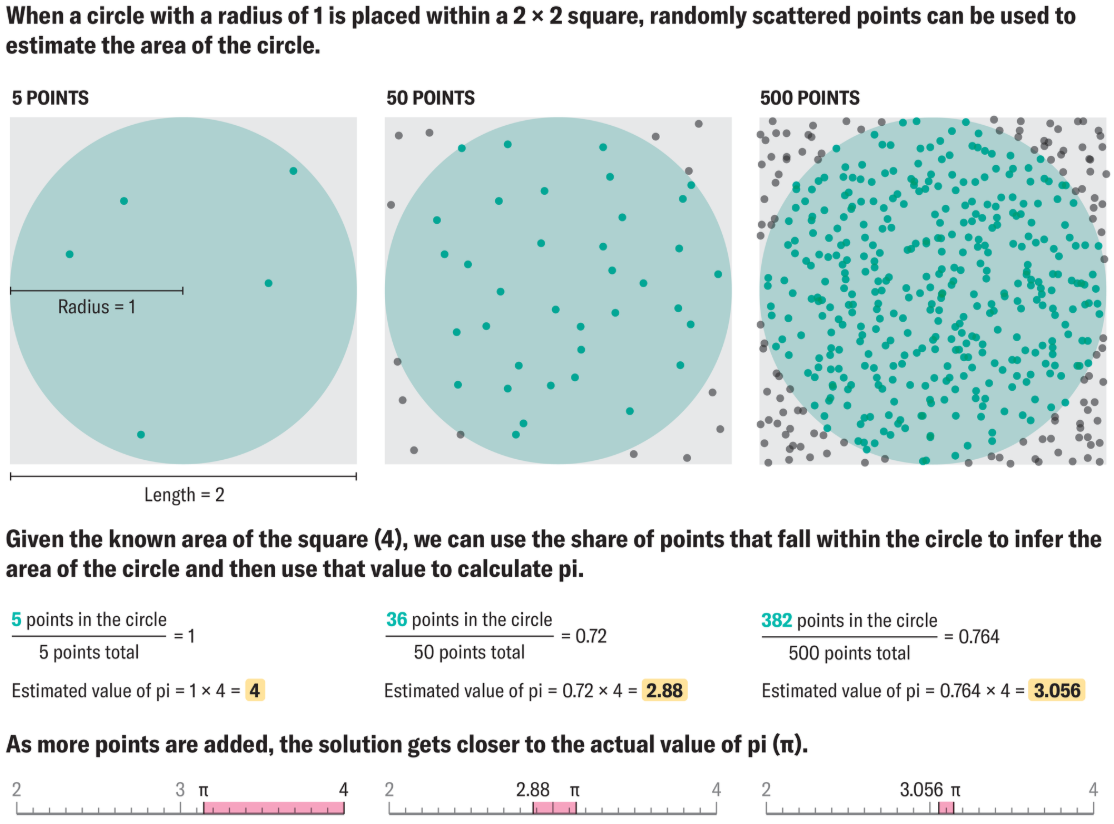 Την αμφιλεγόμενη δουλειά ανέλαβε ο youtuber-μαθηματικός Matt Parker, θέλοντας να γίνει ο πρώτος που θα υπολογίσει το π στη Σελήνη. Αλλά για να μην χρησιμοποιεί τον υπολογιστή του ρόβερ σαν οποιονδήποτε υπολογιστή που υπολογίζει τα ψηφία του π, προτείνει έναν κώδικα που θα ενσωματώνει τυχαίους αριθμούς που θα παράγονται … από τα δεδομένα της Σελήνης που θα συλλέγει το ρόβερ. Χρησιμοποιώντας τυχαίους αριθμούς μπορεί κανείς να υπολογίζει ολοένα και περισσότερα ψηφία του π. Για παράδειγμα, το ρόβερ θα μπορούσε να χρησιμοποιήσει τυχαίους αριθμούς που θα εκφράζουν τις συντεταγμένες μέσα σε ένα τετράγωνο, στο οποίο είναι εγγεγραμμένος ένας κύκλος με ακτίνα 1, και να υπολογίζει τον αριθμό των σημείων που πεφτουν μέσα στον κύκλο: