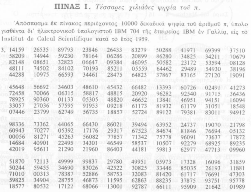 Μεταξύ πολλών άλλων, αναφερόταν και η προσεγγιστική τιμή του Αρχιμήδη π≈22/7, αλλά και η π≈√2+√3≈3,14156, «η οποία επιτρέπει την κατά προσέγγισιν γεωμετρικήν κατασκευήν του αναπτύγματος μιας περιφερείας» . Και στο τέλος της ενότητας παρέθετε 4000 ψηφία του π, που αρκούσαν για να περιπλανηθεί κάποιος, ψάχνοντας να βρει τα μυστικά του σύμπαντος ή κάποιο μήνυμα σαν αυτό που βρήκε ο μαθηματικός Νικόλαος Χατζιδάκις: