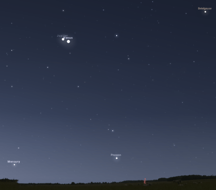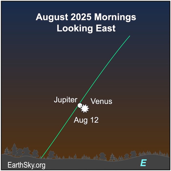 Στις 12 Αυγούστου, η Αφροδίτη και ο Δίας θα φαίνονται πολύ κοντά στον πρωινό ουρανό. Στην πιο κοντινή τους απόσταση, θα απέχουν λιγότερο από 1ο (1 μοίρα). Έτσι, αν τεντώσετε το μικρό σας δάχτυλο κατά μήκος του βραχίονα, θα μπορείτε να κρύψετε και τους δύο πλανήτες πίσω από αυτό.