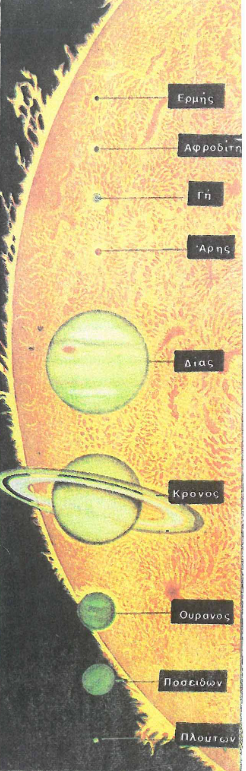 Η απόσταση από τη Γη είναι 150.000.000 km. Η τεράστια ελκτική του δύναμη υποχρεώνει τους πλανήτες να γυρίζουν γύρω από αυτόν. Τα συγκριτικά τους μεγέθη απεικονίζονται στο Σχ. 1.