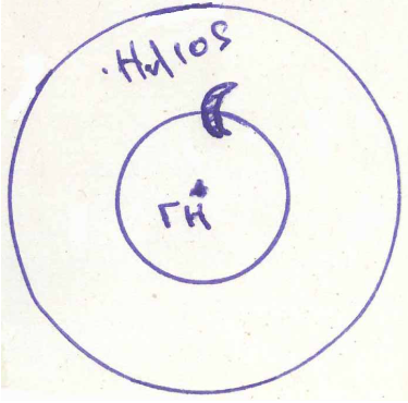 Αν υποθέσουμε ότι ο Ήλιος έπεφτε στη Γη τότε το φεγγάρι μας θα γύριζε στο μέσο του Ηλιακού δίσκου αφού η απόσταση Γης – Σελήνης είναι 380.000 Km περίπου. Σχηματική παράσταση στο Σχ. 2.