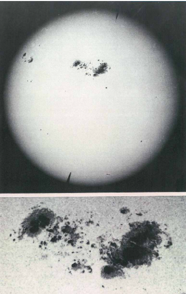 Κλείστε τα παράθυρα ενός δωματίου για να το καταστήσετε τελείως σκοτεινό. Ανοίξτε σε ένα νότιο παράθυρο μια μικρή τρύπα ώστε να εισέρχονται ηλιακές ακτίνες. Τότε θα δείτε στον απέναντι τοίχο ένα φωτεινό κύκλο. Αυτός είναι ο Ήλιος. Θα διακρίνετε πάνω του μελανά στίγματα σαν αυτά που βλέπετε στο Σχ. 3. Είναι οι κηλίδες. Αν σημειώσετε τη θέση τους σήμερα, την επόμενη μέρα θα διαπιστώσετε ότι έχουν μετακινηθεί.