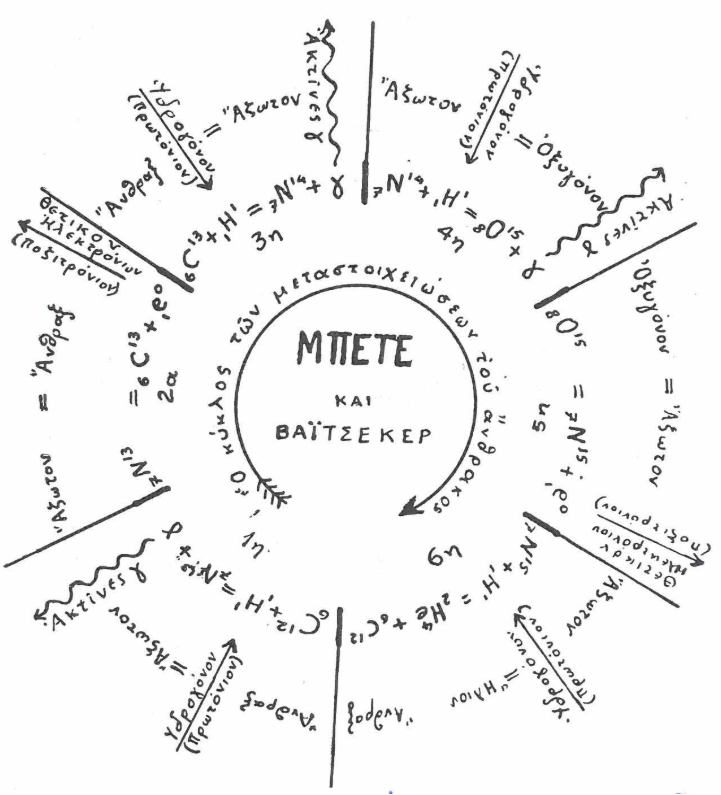 Ο Άτκισον στην Αγγλία και ο Χούτερμανς στη Γερμανία. Αργότερα, το 1938, δυο σπουδαίοι Αστροφυσικοί, ο Μπέτε στις ΗΠΑ και ο Βαϊτζέκερ στη Γερμανία αποκάλυψαν όλο το μηχανισμό του κύκλου του άνθρακα που αποτυπώνεται πρόχειρα στο σκίτσο (Σχ. 7).