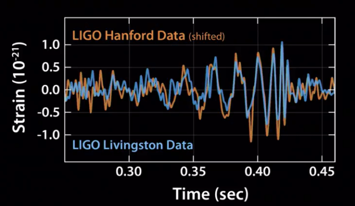 Η διαφορά των 7ms στην άφιξη του σήματος (που δεν φαίνεται στο διάγραμμα) επέτρεψε να προσδιοριστεί μία «ζώνη» στον ουρανό απ’ όπου πρέπει να προήλθε το σήμα. Αν υπήρχε ακόμα ένα «LIGO» σε λειτουργία εκείνη τη στιγμή σε διαφορετική περιοχή προφανώς, θα μπορούσε να προσδιοριστεί η κατεύθυνση με μεγαλύτερη ακρίβεια.