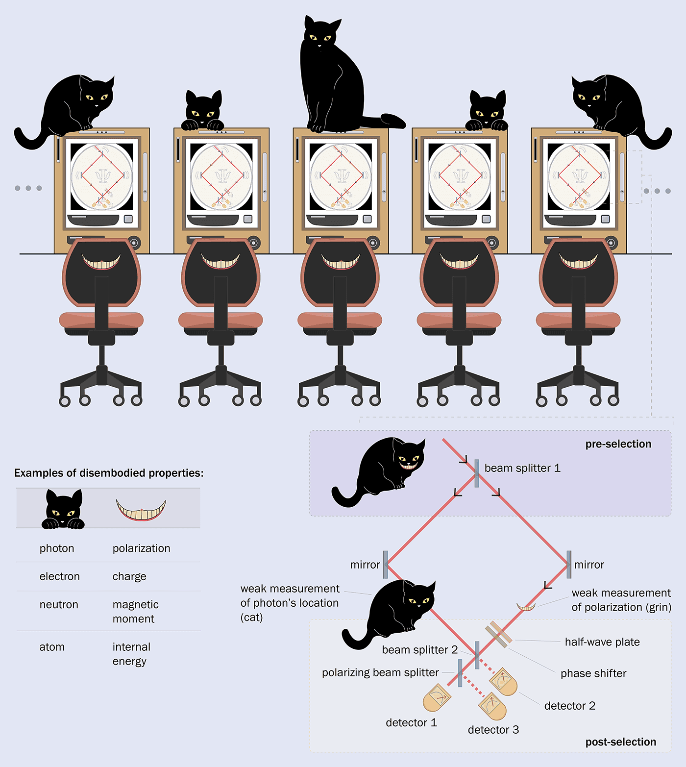 Δεν είναι περίεργο που η Αλίκη εκπλήσσεται. Στην πραγματική ζωή, υποθέτοντας ότι οι γάτες όντως χαμογελούν, το χαμόγελο είναι ιδιότητα της γάτας – δεν έχει νόημα να σκεφτόμαστε ένα χαμόγελο χωρίς γάτα. Και αυτό ισχύει για σχεδόν όλες τις φυσικές ιδιότητες. Για παράδειγμα, η πόλωση είναι ιδιότητα των φωτονίων. Δεν έχει νόημα να μιλάμε για πόλωση χωρίς φωτόνιο. Ωστόσο, όπως υποστήριξαν για πρώτη φορά οι Yakir Aharonov et al στη δημοσίευσή τους το 2013 με τίτλο Quantum Cheshire Cats (New J. Phys. 15 113015), η πόλωση των φωτονίων μπορεί να υπάρχει εκεί που δεν υπάρχει καθόλου φωτόνιο.