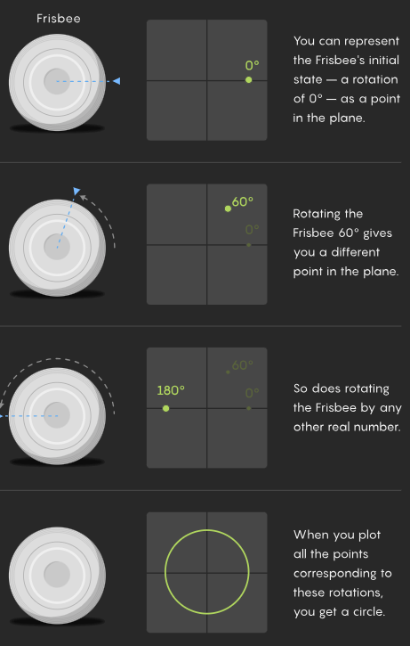 Αυτές οι περιστροφές σχηματίζουν μια ομάδα που ονομάζεται SO(2). Κάθε περιστροφή του δίσκου μπορεί να αναπαρασταθεί ως ένα σημείο στο επίπεδο συντεταγμένων. Αν απεικονίσετε όλες τις πιθανές περιστροφές του δίσκου με αυτόν τον τρόπο, θα καταλήξετε σε άπειρα πολλά σημεία που όλα μαζί σχηματίζουν έναν κύκλο. Αυτή η επιπλέον ιδιότητα είναι που καθιστά την SO(2) μια ομάδα Λι – μπορεί να απεικονιστεί ως ένα λείο, συνεχές σχήμα που ονομάζεται πολλαπλότητα.