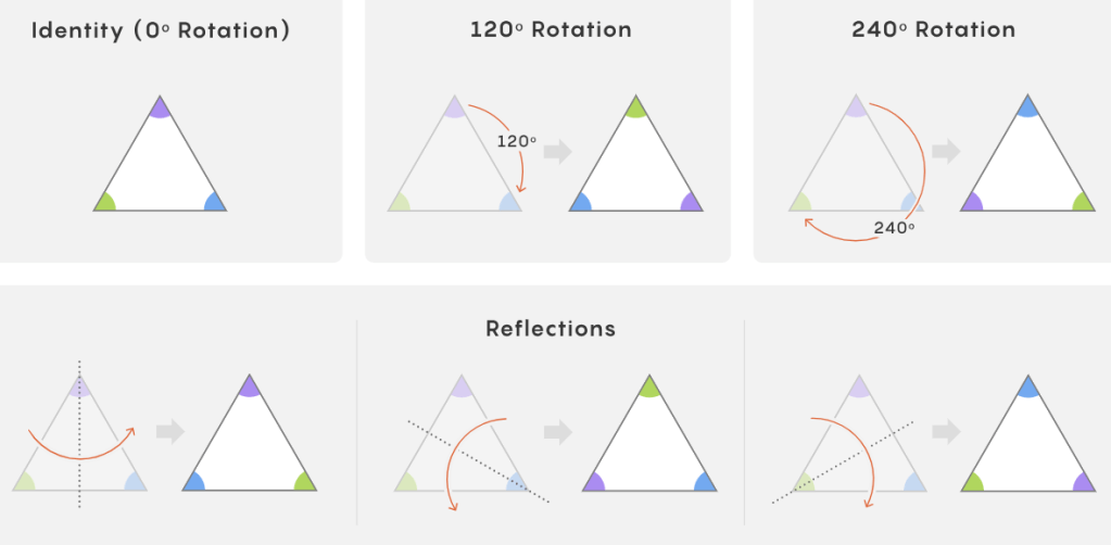 Θεωρείστε τις συμμετρίες του ισόπλευρου τριγώνου. Σχηματίζουν μια ομάδα έξι στοιχείων, όπως φαίνεται εδώ: