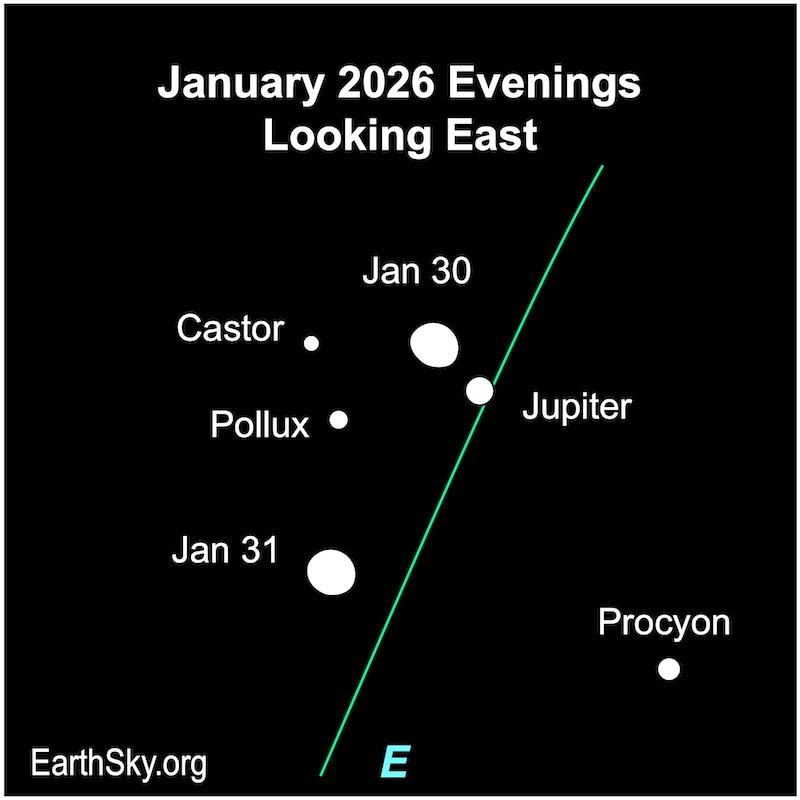 Δίας: Ορατός όλη νύχτα, μεσουρανεί 00:38 στο μέσο του Μήνα (Δίδυμοι, μέγεθος -2,7, διάμετρος 46′ ‘)