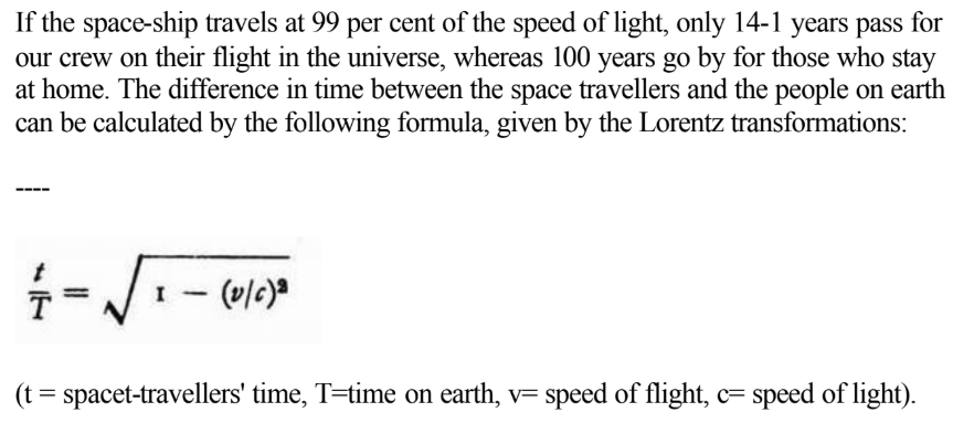 Ο Νταίνικεν μερικές φορές χρησιμοποιούσε και μαθηματικές εξισώσεις για να κάνει πιο πειστική την επιστημονική φαντασία των βιβλίων του. Στο παραπάνω απόσπασμα από το πρώτο του βιβλίο χρησιμοποιεί την εξίσωση διαστολής του χρόνου από την Ειδική Θεωρία της Σχετικότητας.