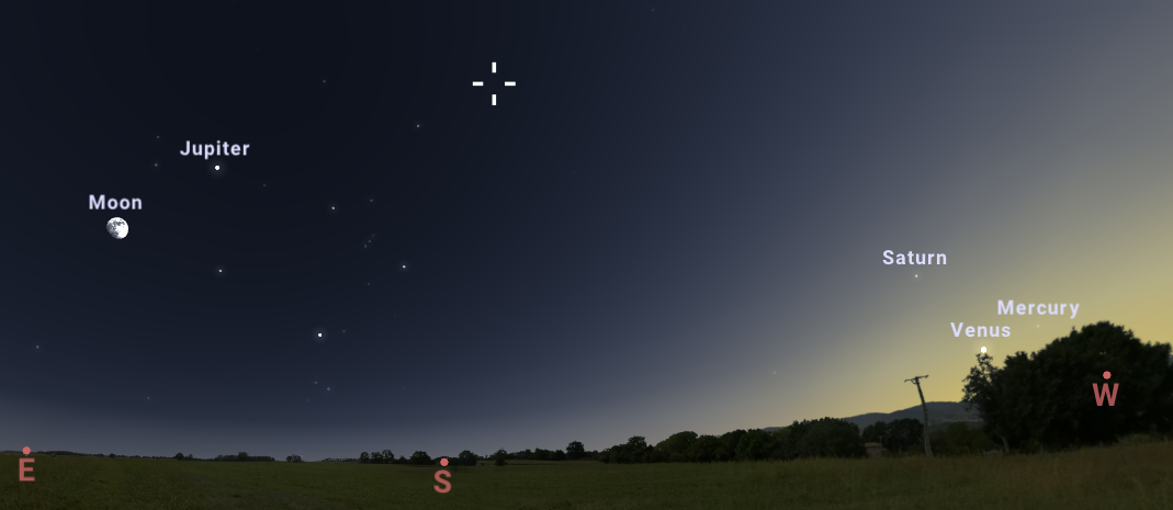 Ο Ερμής, η Αφροδίτη, ο Κρόνος και ο Δίας θα είναι ορατοί δια γυμνού οφθαλμού, ενώ για την παρατήρηση του Ποσειδώνα και του Ουρανού απαιτείται τηλεσκόπιο. Ο Άρης θα είναι ο μόνος πλανήτης που θα απουσιάζει δικαιολογημένα, αφού αυτή την περίοδο συνοδεύει τον Ήλιο – ανατέλλουν και δύουν μαζί.