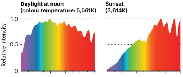 Οι σύγχρονες επιστρώσεις των παραθύρων φιλτράρουν πολλά από τα μεγαλύτερα μήκη κύματος του ηλιακού φωτός (υπέρυθρο) για να μειώσουν την ποσότητα της θερμότητας που εισέρχεται στα κτίρια. Τα φωτιστικά φθορισμού και οι ενεργειακά αποδοτικοί λαμπτήρες LED συγκεντρώνουν την εκπομπή τους σε ένα σχετικά στενό τμήμα του ορατού φάσματος. Αντικαθιστούν ταχύτατα τους παλιούς λαμπτήρες πυρακτώσεως, των οποίων τα πυρακτωμένα νήματα παρήγαγαν μια πολύ ευρύτερη διασπορά μηκών κύματος. Στην πραγματικότητα, περίπου το 90% της ενέργειας ενός λαμπτήρα πυρακτώσεως εκπέμπεται ως υπέρυθρη ακτινοβολία. Οι επερχόμενες αναθεωρήσεις στα πρότυπα κτιρίων και φωτισμού των ΗΠΑ, που προγραμματίζονται για το 2028, αναμένεται να περιορίσουν ακόμη περισσότερο το φάσμα του φωτός που είναι διαθέσιμο σε εσωτερικούς χώρους.