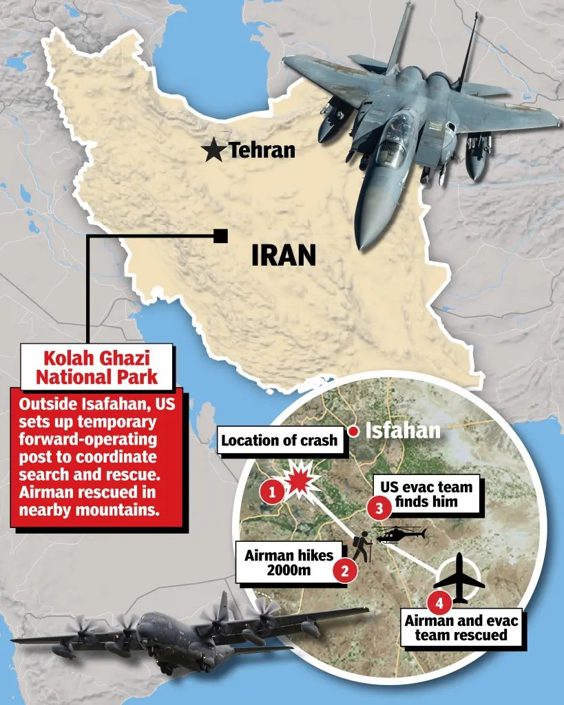 Στις 3 Απριλίου του 2026, ένα μαχητικό αεροσκάφος της αμερικανικής πολεμικής αεροπορίας καταρρίφθηκε πάνω από το νοτιοδυτικό Ιράν. Και τα δύο μέλη του πληρώματος εκτινάχθηκαν με αλεξίπτωτα. Ενώ ο πιλότος διασώθηκε την ίδια μέρα από ελικόπτερα, ο αξιωματικός οπλικών συστημάτων που επέβαινε επίσης, αγνοείτο. Διέθετε έναν πομπό που χρησιμοποίησε για να στείλει σήμα, αλλά αυτός παρείχε μόνο μια γενική τοποθεσία κατά προσέγγιση σε μια περιοχή εκατοντάδων τετραγωνικών χιλιομέτρων. Τελικά, στις 5 Απριλίου, διασώθηκε επιτυχώς σε μια νυχτερινή επιχείρηση στην οποία συμμετείχαν δεκάδες αεροσκάφη, τραυματισμένος μεν, αλλά ζωντανός. Κατά την διάρκεια συνέντευξης τύπου την επόμενη μέρα, ο Τραμπ την αποκάλεσε «μία από τις πιο τολμηρές επιχειρήσεις έρευνας και διάσωσης στην ιστορία των ΗΠΑ».