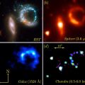 Η παραπάνω σύνθεση περιέχει τέσσερις φωτογραφίες του ίδιου αντικειμένου. Πρόκειται για δύο γαλαξίες – γνωστοί και οι δυο μαζί ως Arp 147 – που συγκρούστηκαν στο παρελθόν, όπως φαίνονται από τα διαστημικά τηλεσκόπια Hubble, Chandra («βλέπει» ακτίνες Χ), Galex («βλέπει»… Read More ›