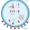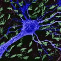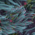 Η εικόνα είναι από ηλεκτρονικό μικροσκόπιο σάρωσης (SEM) και χρωματίστηκε εκ των υστέρων. Δείχνει κύτταρα των πνευμόνων (μωβ) καλυμμένα από βλεφαρίδες (μπλε). Οι βλεφαρίδες που μοιάζουν με τριχίδια βοηθούν στον καθαρισμό της βλέννας (κιτρινοπράσινο) που περιέχει σκόνη και άλλα σωματίδια… Read More ›
