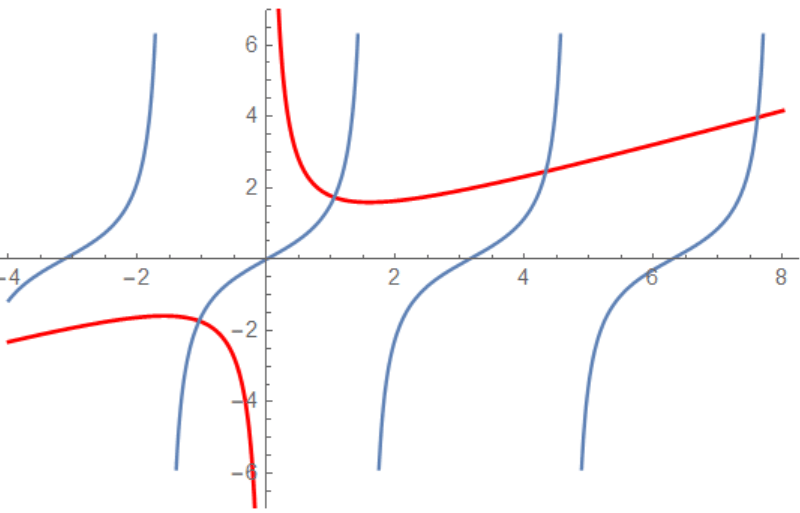 Η κόκκινη καμπύλη παριστάνει την f(φ) και η μπλε την tanφ